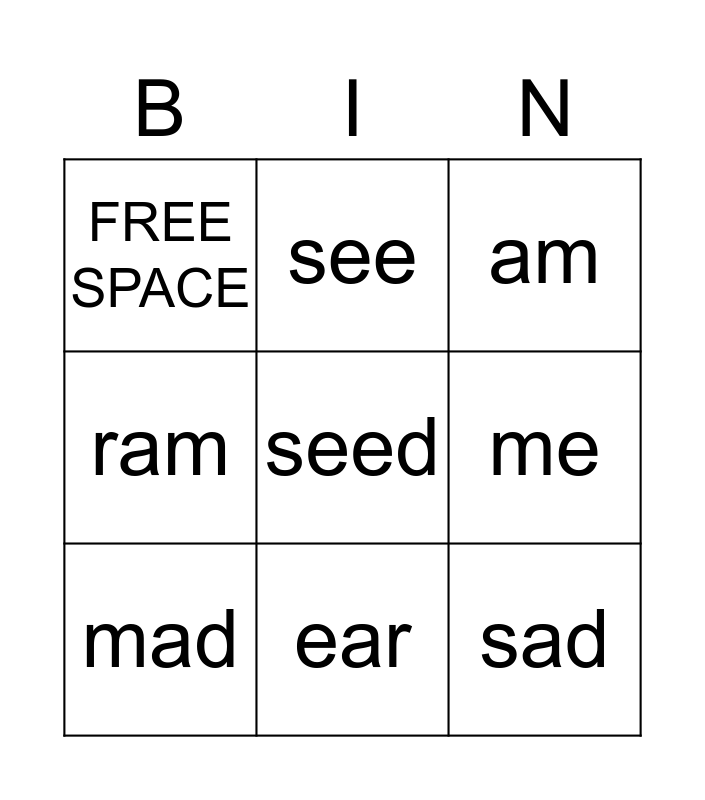 This bingo card has a free space and 8 words: me, am, see, mad, FREE SPACE, sad, ram and ear.