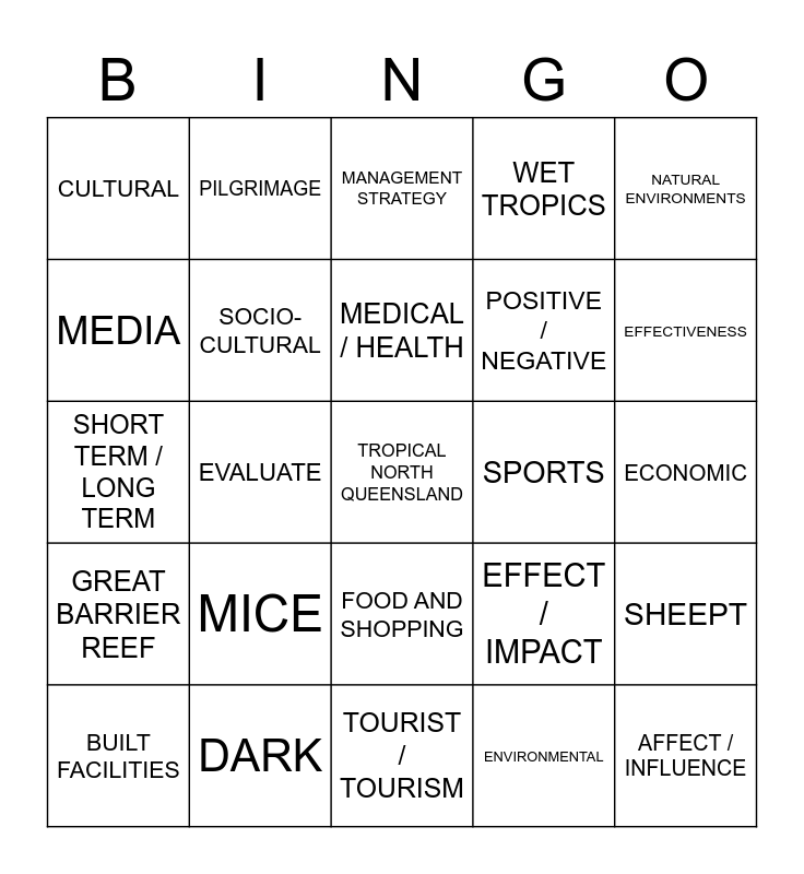 This bingo card has a free space and 24 words: MICE, DARK, MEDICAL / HEALTH, BUILT FACILITIES, NATURAL ENVIRONMENTS, CULTURAL, MEDIA, PILGRIMAGE, SPORTS, FOOD AND SHOPPING, POSITIVE / NEGATIVE, SHORT TERM / LONG TERM, EFFECT / IMPACT, SHEEPT, SOCIO-CULTURAL, ENVIRONMENTAL, ECONOMIC, MANAGEMENT STRATEGY, EFFECTIVENESS, EVALUATE, AFFECT / INFLUENCE, GREAT BARRIER REEF, WET TROPICS and TOURIST / TOURISM.