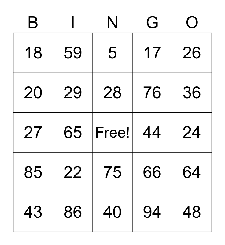 This bingo card has a free space and 78 words: 1, 4, 5, 6, 7, 9, 10, 11, 12, 13, 15, 16, 17, 18, 19, 20, 21, 22, 23, 24, 25, 26, 27, 28, 29, 30, 31, 32, 34, 35, 36, 39, 40, 41, 43, 44, 45, 46, 47, 48, 49, 50, 51, 53, 56, 59, 60, 61, 62, 63, 64, 65, 66, 68, 69, 71, 72, 73, 74, 75, 76, 77, 79, 80, 81, 82, 83, 84, 85, 86, 87, 88, 90, 91, 94, 96, 97 and 98.