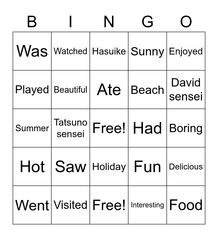 This bingo card has a free space and 24 words: Saw, Visited, Ate, Went, Enjoyed, Was, Played, Watched, Had, Holiday, Beach, Summer, Fun, Delicious, Beautiful, Interesting, Boring, Hasuike, David sensei, Tatsuno sensei, Food, Hot, Sunny and Free!.