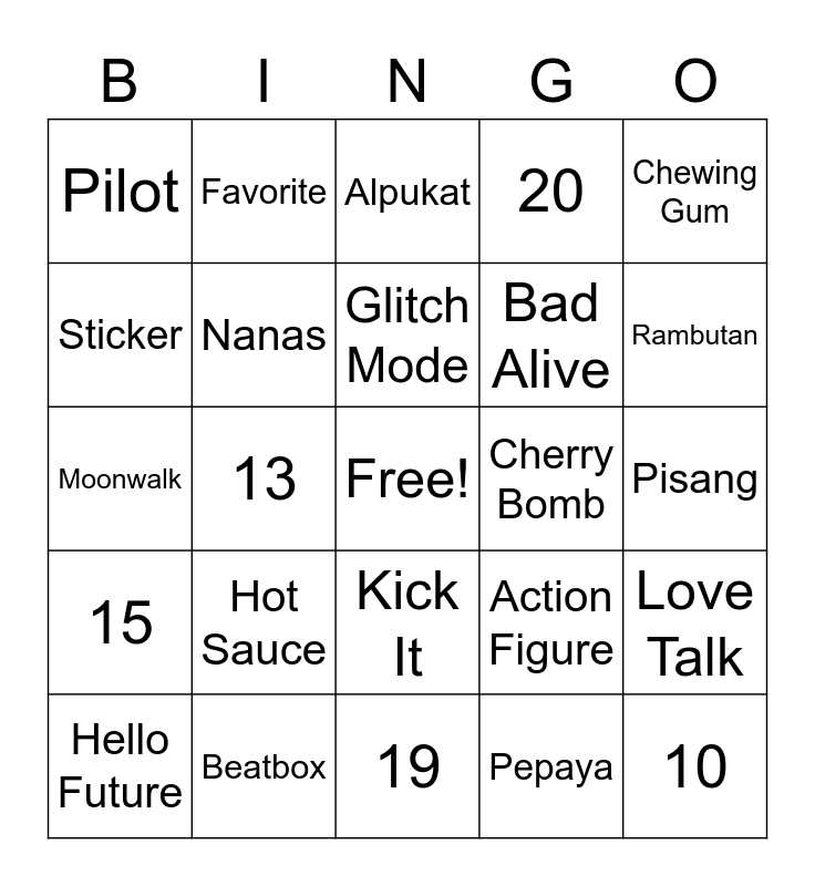 This bingo card has a free space and 24 words: Hot Sauce, Beatbox, Glitch Mode, Hello Future, Chewing Gum, Pilot, Sticker, Favorite, Cherry Bomb, Kick It, Bad Alive, Moonwalk, Action Figure, Love Talk, Nanas, Pepaya, Pisang, Alpukat, Rambutan, 13, 10, 15, 20 and 19.