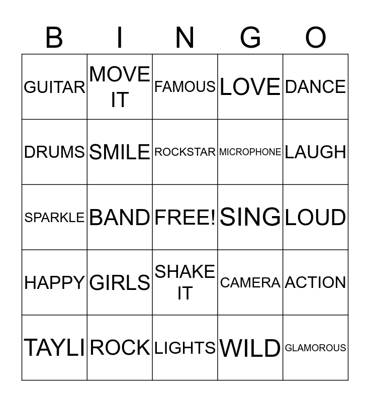 This bingo card has a free space and 24 words: GIRLS, ROCK, ROCKSTAR, TAYLI, DANCE, GUITAR, DRUMS, MOVE IT, SING, SHAKE IT, MICROPHONE, SPARKLE, CAMERA, ACTION, SMILE, WILD, LOUD, FAMOUS, LAUGH, BAND, GLAMOROUS, HAPPY, LOVE and LIGHTS.