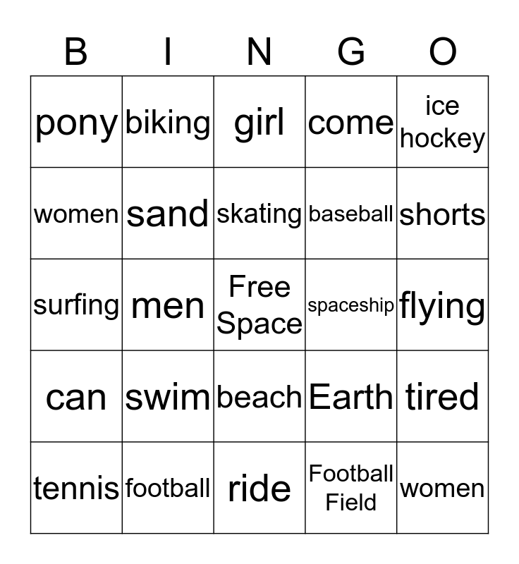This bingo card has a free space and 24 words: swim, football, skating, tennis, ice hockey, pony, women, biking, spaceship, beach, baseball, surfing, Earth, tired, sand, Football Field, flying, girl, shorts, men, women, can, come and ride.