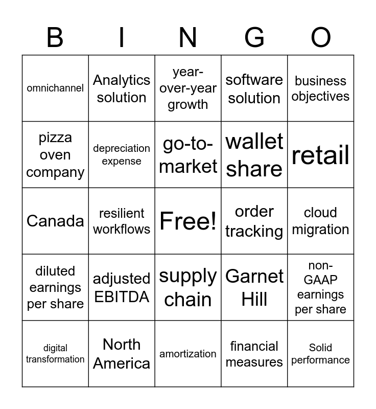 This bingo card has a free space and 42 words: Second Quarter, go-to-market, Form 10-K, adjusted EBITDA, financial measures, non-GAAP earnings per share, Solid performance, EDI, year-over-year growth, supply chain, cloud migration, retail, resilient workflows, business objectives, HVAC manufacturer, Garnet Hill, Peavey, Canada, 45,000 SKUs, Analytics solution, pizza oven company, Crocs, GCommerce, omnichannel, financial results, Recurring revenue, wallet share, cash and investments, board of directors, guidance, foreign exchange rates, diluted earnings per share, depreciation expense, amortization, effective tax rate, digital transformation, North America, order tracking, revenue, fulfillment, software solution and Thanks Archie.