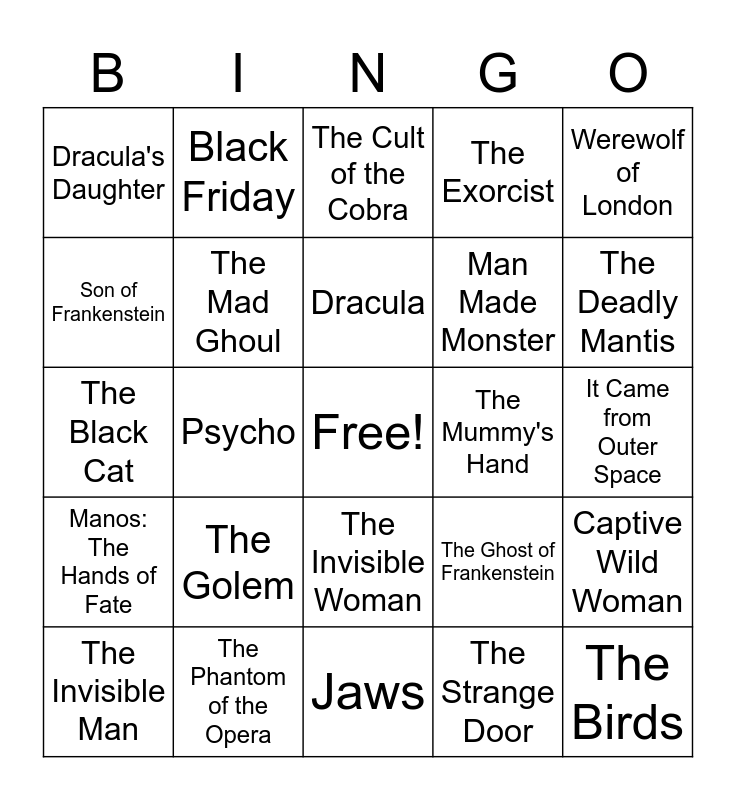 This bingo card has a free space and 24 words: The Golem, The Phantom of the Opera, Dracula, The Invisible Man, Werewolf of London, Dracula's Daughter, Son of Frankenstein, Black Friday, The Mummy's Hand, The Invisible Woman, Man Made Monster, The Black Cat, The Ghost of Frankenstein, Captive Wild Woman, The Mad Ghoul, The Strange Door, It Came from Outer Space, The Cult of the Cobra, The Deadly Mantis, Psycho, The Birds, Manos: The Hands of Fate, The Exorcist and Jaws.