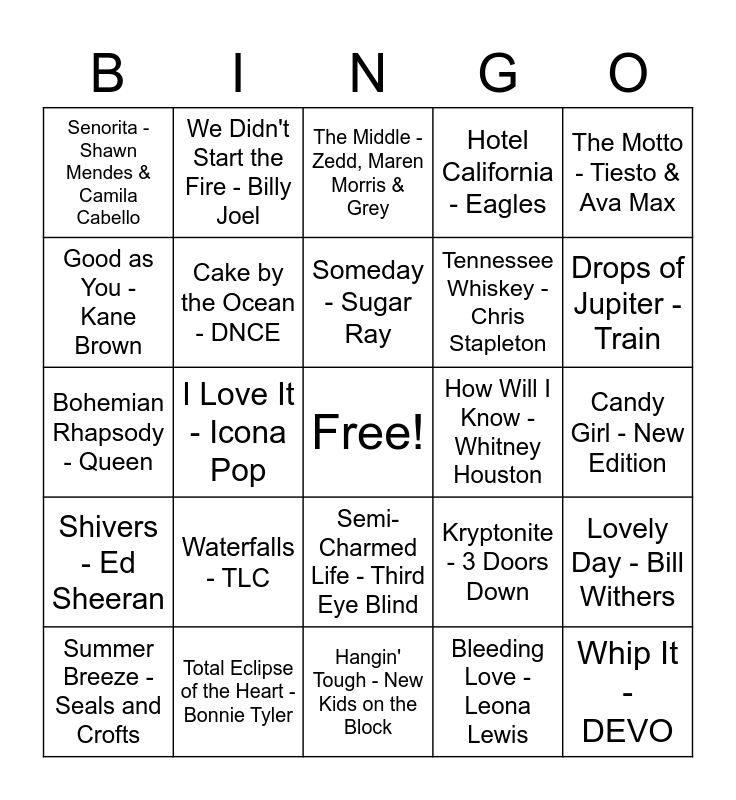 This bingo card has a free space and 29 words: Summer Breeze - Seals and Crofts, Royals - Lorde, I Love It - Icona Pop, Sunflower - Post Malone & Swae Lee, Senorita - Shawn Mendes & Camila Cabello, The Middle - Zedd, Maren Morris & Grey, Cake by the Ocean - DNCE, Waterfalls - TLC, How Will I Know - Whitney Houston, Total Eclipse of the Heart - Bonnie Tyler, Candy Girl - New Edition, Whip It - DEVO, Hangin' Tough - New Kids on the Block, Bleeding Love - Leona Lewis, Drops of Jupiter - Train, Dreams - Fleetwood Mac, Semi-Charmed Life - Third Eye Blind, Shivers - Ed Sheeran, The Motto - Tiesto & Ava Max, Bohemian Rhapsody - Queen, Kryptonite - 3 Doors Down, Jack & Diane - John Mellencamp, Tennessee Whiskey - Chris Stapleton, Good as You - Kane Brown, Hotel California - Eagles, We Didn't Start the Fire - Billy Joel, Lovely Day - Bill Withers, Someday - Sugar Ray and Cupid Shuffle - Cupid.