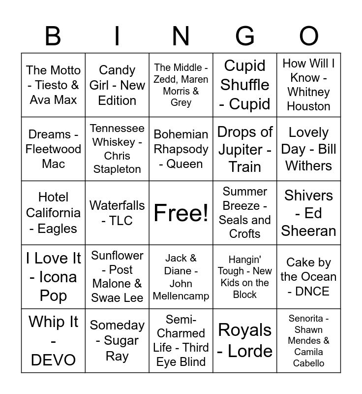 This bingo card has a free space and 29 words: Whip It - DEVO, We Didn't Start the Fire - Billy Joel, Waterfalls - TLC, Total Eclipse of the Heart - Bonnie Tyler, The Motto - Tiesto & Ava Max, The Middle - Zedd, Maren Morris & Grey, Tennessee Whiskey - Chris Stapleton, Sunflower - Post Malone & Swae Lee, Summer Breeze - Seals and Crofts, Someday - Sugar Ray, Shivers - Ed Sheeran, Senorita - Shawn Mendes & Camila Cabello, Semi-Charmed Life - Third Eye Blind, Royals - Lorde, Lovely Day - Bill Withers, Kryptonite - 3 Doors Down, Jack & Diane - John Mellencamp, I Love It - Icona Pop, How Will I Know - Whitney Houston, Hotel California - Eagles, Hangin' Tough - New Kids on the Block, Good as You - Kane Brown, Drops of Jupiter - Train, Dreams - Fleetwood Mac, Cupid Shuffle - Cupid, Candy Girl - New Edition, Cake by the Ocean - DNCE, Bohemian Rhapsody - Queen and Bleeding Love - Leona Lewis.