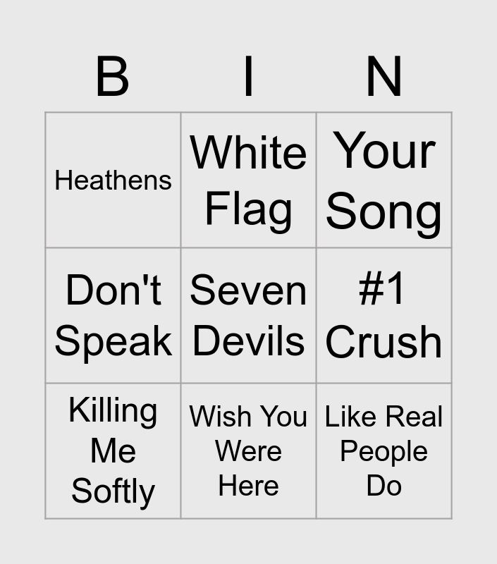 This bingo card has a free space and 8 words: #1 Crush, Your Song, White Flag, Killing Me Softly, Heathens, Like Real People Do, Don't Speak and Wish You Were Here.
