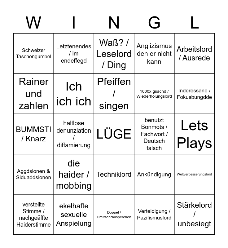 This bingo card has a free space and 53 words: Schnauf / ßo, Stärkelord / unbesiegt, Fränkeln, Verteidigung / Pazifismuslord, die haider / mobbing, der witz is / faggd ist / pointe is, Letztenendes / im endeffegd, seit X Jahren / mei ganses Lebne, Rainer und zahlen, Kinnergarten / sorry, Ich ich ich, gefakedes lachen, Weltverbesserungslord, Ankündigung, mei zeuch machne / mei leben lebne, verstellte Stimme / nachgeäffte Haiderstimme, Pfeiffen / singen, benutzt Bonmots / Fachwort / Deutsch falsch, Polizei, Arbeitslord / Ausrede, haltlose denunziation / diffamierung, Privatsache, 1000x gsachd / Wiederholungslord, Schweizer Taschengumbel, Ihr wisst nichts / 2%, ekelhafte sexuelle Anspielung, richtig schlechter Konter, nennt Haidernamen / Beleidigung, Warumääh / warum sollde ich?, Inderessand / Fokusbungdde, ich raffs ned / hab ich vergessne, Froindin, Hergehen / scheise baun, Rage / Neidwut / Mana, Derjeniche / diejenichen, Facepalm / Slow Clap, Anglizismus den er nicht kann, Doppel / Dreifachräusperchen, Waß? / Leselord / Ding, Rudi / Körperfunktionen, Belehrungslord, Sprich / wie gsachd, Lets Plays, Brinzibiell / Im Brinzib, nicht mal ansatzweise / bei weitem, Techniklord, Spielzeug / Gadget / Bettellord, Banhammer / asozial, BUMMSTI / Knarz, Aggdsionen & Siduaddsionen, musiklord (kein meddl), Schlaganfall / verliert Faden and löcher im Shirt / Verletzung.
