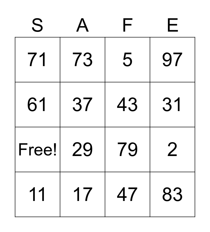 This bingo card has 20 words: 2, 53, 5, 59, 11, 61, 17, 71, Free!, 73, 29, 79, 37, 83, 43, 89, 31, 97, 47 and 19.
