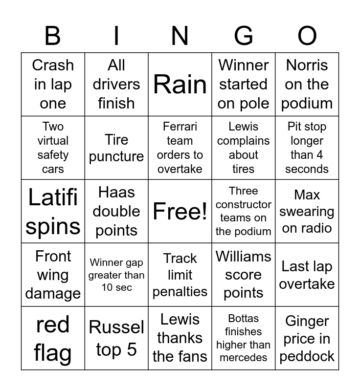 This bingo card has a free space and 29 words: red flag, Safety car, Haas double points, Aston Martin DNF, Crash in lap one, Rain, Tire puncture, Winner gap greater than 10 sec, Three constructor teams on the podium, Russel top 5, Max swearing on radio, Ginger price in peddock, Lewis thanks the fans, Bottas finishes higher than mercedes, Pit stop longer than 4 seconds, Team mate collision, Track limit penalties, Front wing damage, Norris on the podium, Latifi spins, Williams score points, Smoking engine, Lewis complains about tires, Two virtual safety cars, Winner started on pole, All drivers finish, Last lap overtake, Ferrari team orders to overtake and First time winner.