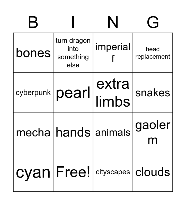 This bingo card has 16 words: Free!, gaoler m, imperial f, bones, mecha, turn dragon into something else, animals, cityscapes, cyberpunk, pearl, cyan, head replacement, hands, snakes, extra limbs and clouds.