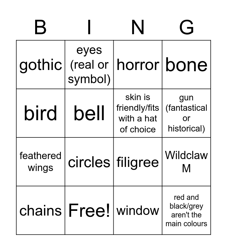 This bingo card has 16 words: Free!, Wildclaw M, horror, gothic, feathered wings, eyes (real or symbol), filigree, window, bird, bell, chains, bone, circles, gun (fantastical or historical), skin is friendly/fits with a hat of choice and red and black/grey aren't the main colours.