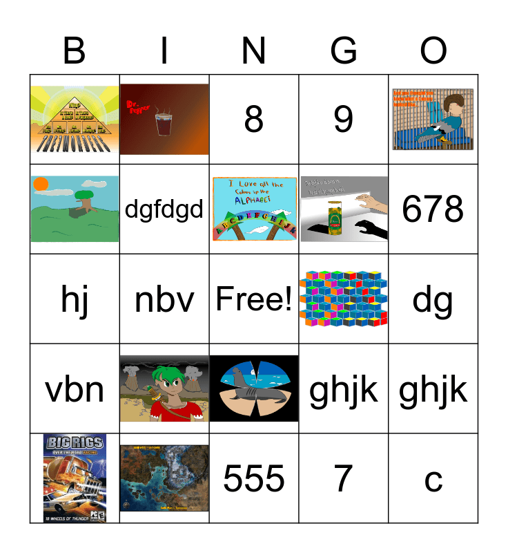 This bingo card has 11 images, a free space and 13 words: hj, ghjk, ghjk, dgfdgd, 7, dg, 8, 678, nbv, c, vbn, 9 and 555.