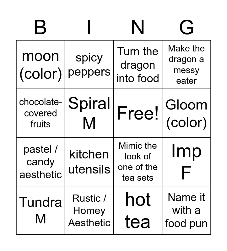 This bingo card has 16 words: Tundra M, Rustic / Homey Aesthetic, Turn the dragon into food, Make the dragon a messy eater, chocolate-covered fruits, spicy peppers, Mimic the look of one of the tea sets, Imp F, moon (color), Spiral M, hot tea, Gloom (color), pastel / candy aesthetic, kitchen utensils, Free! and Name it with a food pun.
