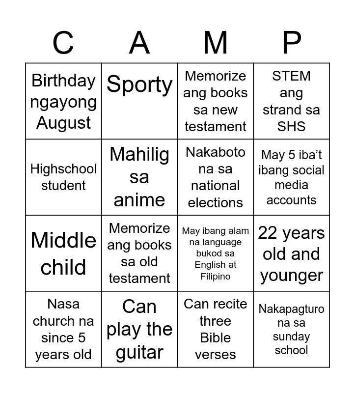 This bingo card has 16 words: Can play the guitar, 22 years old and younger, Memorize ang books sa new testament, Birthday ngayong August, Middle child, Sporty, May ibang alam na language bukod sa English at Filipino, Can recite three Bible verses, Highschool student, Mahilig sa anime, Nasa church na since 5 years old, STEM ang strand sa SHS, Memorize ang books sa old testament, May 5 iba’t ibang social media accounts, Nakaboto na sa national elections and Nakapagturo na sa sunday school.