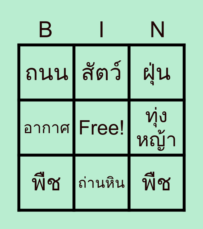 This bingo card has 1 images, a free space and 14 words: ดิน, น้ำ, ฝุ่น, ถนน, ถ่านหิน, พืช, โอโซน, ทุ่งหญ้า, สัตว์ป่า, แร่ธาตุ, อากาศ, พืช, สัตว์ and เขื่อนกั้นน้ำ.