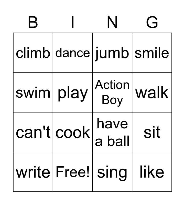 This bingo card has 25 words: run, fly, walk, talk, swim, climb, play, dance, Free!, can, can't, have a ball, football, toy, Action Boy, drink, sing, jumb, cook, sit, write, tennis, like, smile and book.