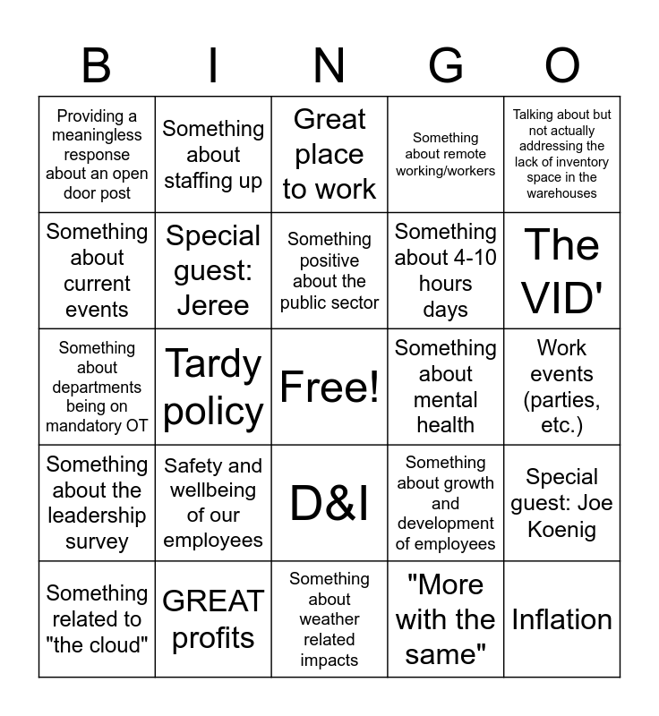 This bingo card has a free space and 24 words: Safety and wellbeing of our employees, GREAT profits, Something positive about the public sector, Something related to "the cloud", Talking about but not actually addressing the lack of inventory space in the warehouses, Providing a meaningless response about an open door post, Something about current events, Something about staffing up, Something about mental health, D&I, Something about 4-10 hours days, Something about departments being on mandatory OT, Something about growth and development of employees, Special guest: Joe Koenig, Special guest: Jeree, "More with the same", Work events (parties, etc.), Great place to work, The VID', Tardy policy, Inflation, Something about the leadership survey, Something about remote working/workers and Something about weather related impacts.