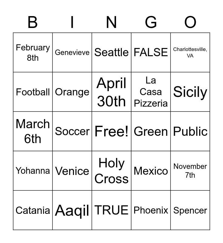 This bingo card has a free space and 24 words: Venice, Aaqil, April 30th, Catania, Charlottesville, VA, February 8th, Football, Genevieve, Green, Holy Cross, La Casa Pizzeria, March 6th, Mexico, November 7th, Orange, Phoenix, Public, Seattle, Sicily, Soccer, Spencer, Yohanna, FALSE and TRUE.