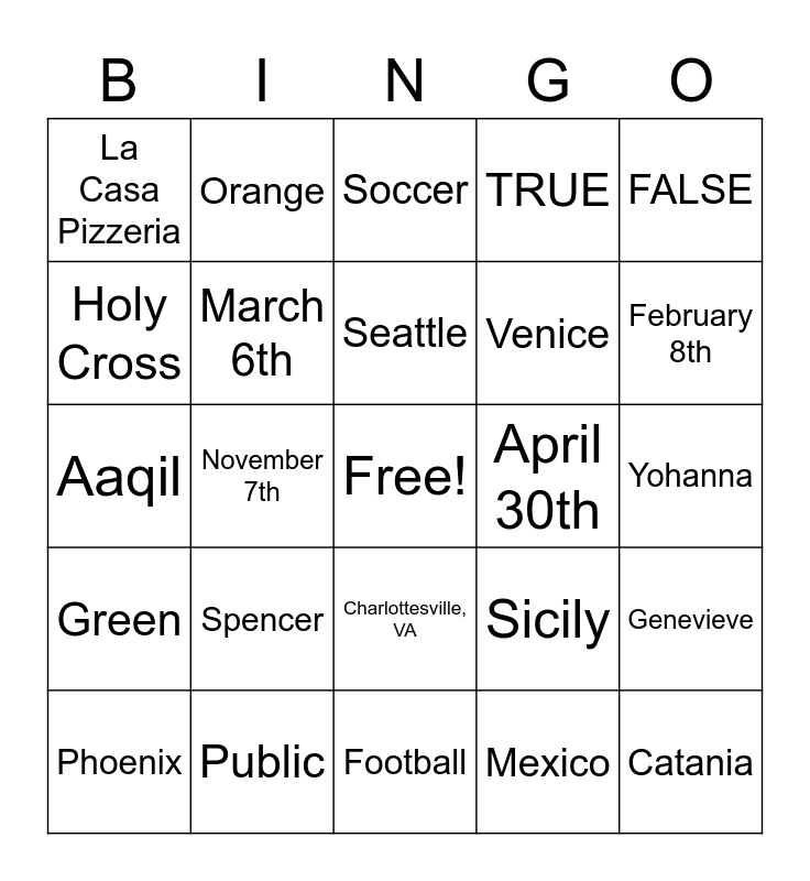 This bingo card has a free space and 24 words: Spencer, Public, Seattle, Phoenix, FALSE, La Casa Pizzeria, Holy Cross, Orange, April 30th, Charlottesville, VA, Venice, Aaqil, Sicily, Genevieve, March 6th, Mexico, Yohanna, Soccer, February 8th, November 7th, Catania, Green, TRUE and Football.