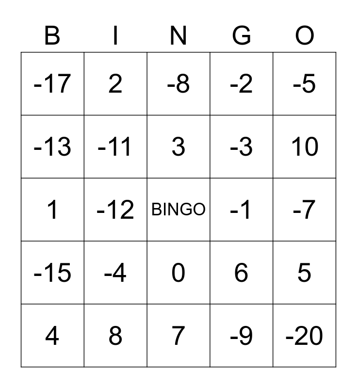 This bingo card has a free space and 24 words: -4, 8, 3, 4, -5, -17, -13, 2, -1, 0, -3, 1, 6, 5, -11, -9, -7, -8, 10, -12, -20, -15, -2 and 7.