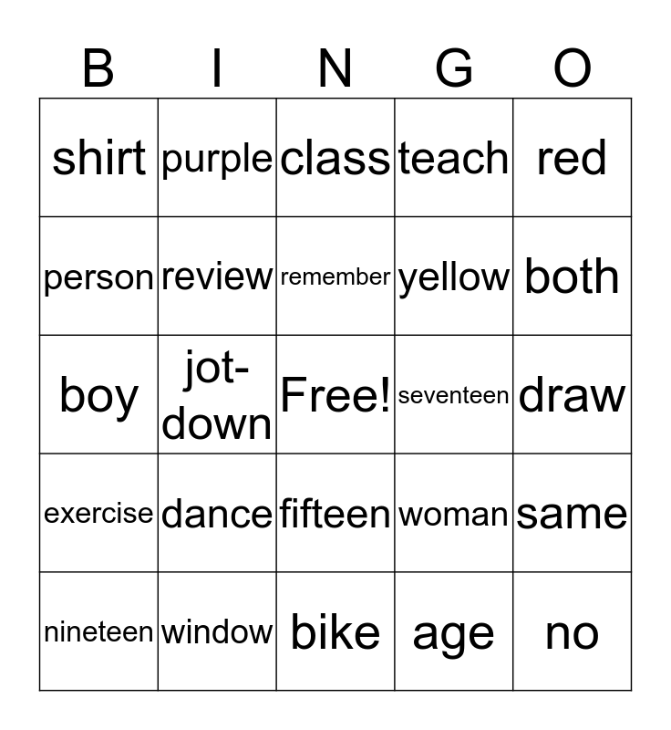 This bingo card has a free space and 24 words: dance, window, remember, nineteen, red, shirt, person, purple, seventeen, fifteen, yellow, boy, woman, same, review, age, draw, class, both, jot-down, no, exercise, teach and bike.