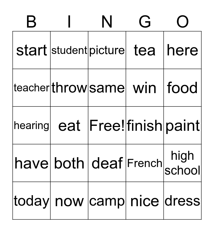 This bingo card has a free space and 24 words: both, now, same, today, here, start, teacher, student, finish, deaf, win, hearing, French, high school, throw, nice, paint, picture, food, eat, dress, have, tea and camp.
