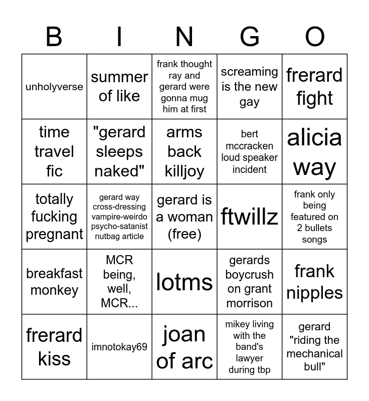 This bingo card has a free space and 24 words: MCR being, well, MCR..., imnotokay69, arms back killjoy, frerard kiss, frerard fight, unholyverse, time travel fic, summer of like, ftwillz, lotms, bert mccracken loud speaker incident, totally fucking pregnant, gerards boycrush on grant morrison, frank nipples, "gerard sleeps naked", mikey living with the band's lawyer during tbp, frank only being featured on 2 bullets songs, frank thought ray and gerard were gonna mug him at first, alicia way, gerard way cross-dressing vampire-weirdo psycho-satanist nutbag article, gerard "riding the mechanical bull", breakfast monkey, screaming is the new gay and joan of arc.