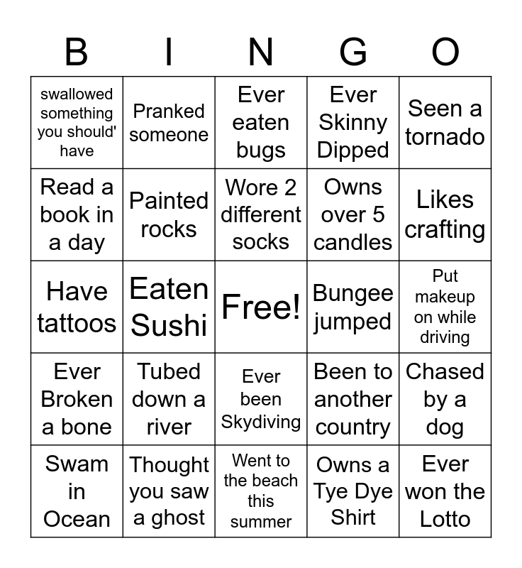 This bingo card has a free space and 29 words: Swam in Ocean, Gotten a speeding ticket, Eaten Sushi, Ever replaced car engine, swallowed something you should' have, Ever eaten bugs, Painted rocks, Tubed down a river, Bungee jumped, Thought you saw a ghost, Put makeup on while driving, Ever won the Lotto, Went to the beach this summer, Owns a Tye Dye Shirt, Likes crafting, Ever Been Rock Climbing, Ever been Skydiving, Ever Broken a bone, Seen a tornado, Have tattoos, Been to another country, Won a competition, Owns over 5 candles, Read a book in a day, Ever Skinny Dipped, Pranked someone, Chased by a dog, Wore 2 different socks and Befriended a stranger.
