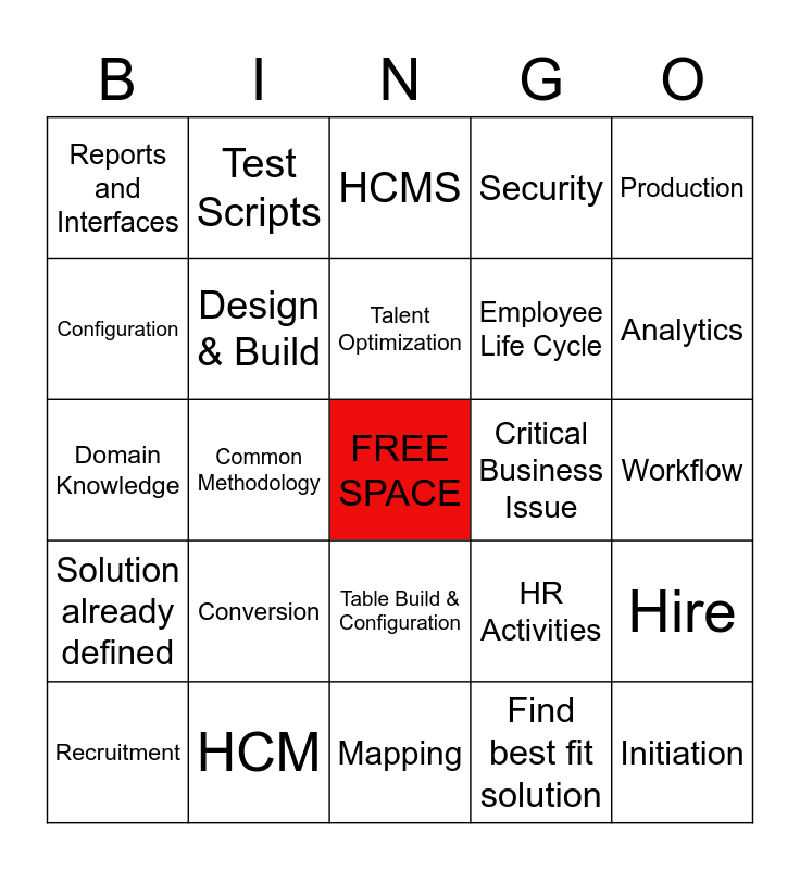 This bingo card has a free space and 30 words: HCM, Validation, Common Methodology, Iterative, Reports and Interfaces, HCMS, Design & Build, Table Build & Configuration, Critical Business Issue, Mapping, Workflow, Initiation, Find best fit solution, Client and Vendor Testing, Analytics, Employees, HR Activities, Solution already defined, Conversion, Production, Domain Knowledge, Requirements Gathering, Test Scripts, Employee Life Cycle, Configuration, Security, Hire, Recruitment, Talent Optimization and Collaboration.