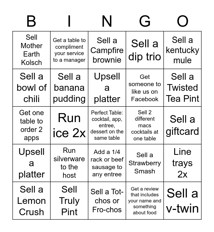 This bingo card has a free space and 34 words: Sell Truly Pint, Get a review that includes your name and something about food, Run someone elses drinks, Sell Cabarrus Vanilla Pint, Upsell a platter, Sell a banana pudding, Sell a kentucky mule, Sell a Lemon Crush, Get a table to compliment your service to a manager, Bus another servers table 2x, Upsell a platter, Sell a Campfire brownie, Get a review that includes your name and something about food, Sell a bottle of wine, Sell 2 different macs cocktails at one table, Sell a Twisted Tea Pint, Sell Truly Pint, Get one table to order 2 apps, Run silverware to the host, Sell a Strawberry Smash, Add a 1/4 rack or beef sausage to any entree, Sell hog skins, Sell Mother Earth Kolsch, Sell a giftcard, Sell a Tot-chos or Fro-chos, Sell a v-twin, Sell a dip trio, Sell a Highland Gaelic Pint, Get someone to like us on Facebook, Sell a bowl of chili, Sell a bowl of stew, Run ice 2x, Line trays 2x and Run food 3x.