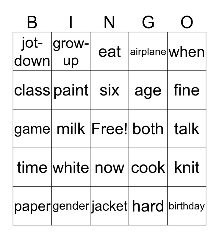 This bingo card has a free space and 24 words: white, gender, six, paper, when, jot-down, class, grow-up, both, now, age, game, cook, knit, paint, hard, talk, eat, fine, milk, birthday, time, airplane and jacket.