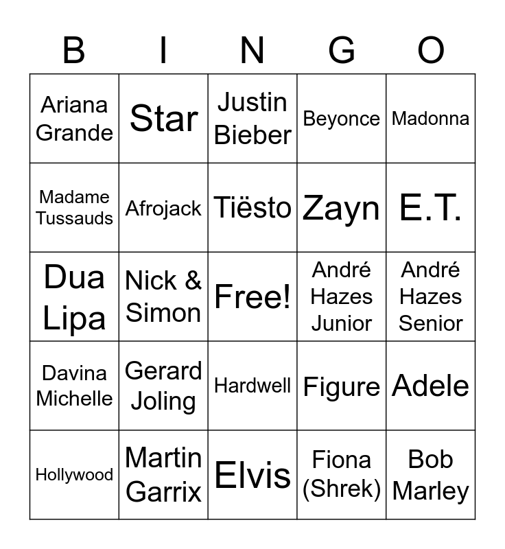 This bingo card has a free space and 41 words: Freddy Mercury, Dua Lipa, Lady Gaga, Afrojack, Martin Garrix, Hardwell, Tiësto, Armin van Buuren, Madonna, Davina Michelle, Nick & Simon, Beyonce, Bob Marley, André Hazes Senior, André Hazes Junior, Gerard Joling, Guus Meeuwis, Ariana Grande, Taylor Swift, Justin Bieber, Adele, Michael Jackson, Elvis, Zayn, Johnny Depp, Daniel Craig, Fiona (Shrek), Marilyn Monroe, E.T., The Fame Experience, Celebrity, Star, Hollywood, Wax, Figure, Madame Tussauds, Amsterdam, Spotlight, VIP, A-list and Red Carpet.