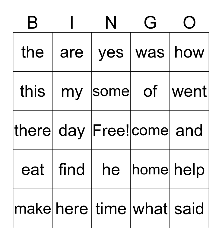 This bingo card has a free space and 24 words: find, here, some, make, how, the, this, are, come, he, of, there, home, help, my, what, and, yes, went, day, said, eat, was and time.