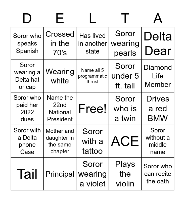 This bingo card has a free space and 24 words: Mother and daughter in the same chapter, Principal, Name all 5 programmatic thrust, Tail, Delta Dear, Soror who speaks Spanish, Soror wearing a Delta hat or cap, Crossed in the 70's, Soror who is a twin, Soror with a tattoo, Soror under 5 ft. tall, Soror who paid her 2022 dues, ACE, Soror without a middle name, Wearing white, Plays the violin, Drives a red BMW, Has lived in another state, Diamond Life Member, Name the 22nd National President, Soror who can recite the oath, Soror with a Delta phone Case, Soror wearing pearls and Soror wearing a violet.