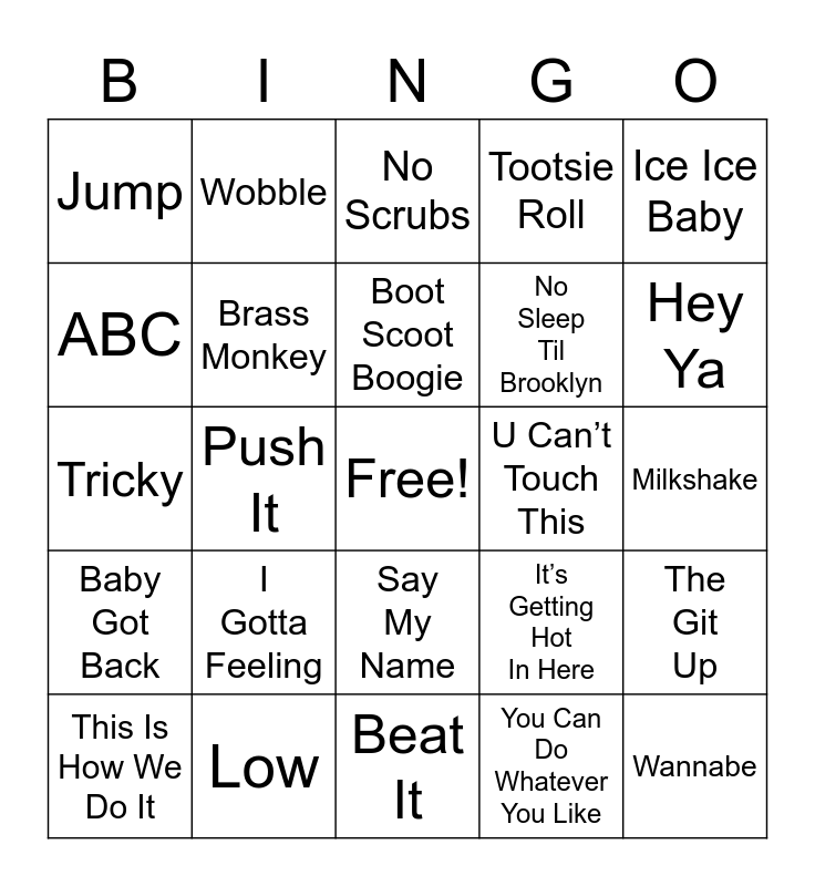 This bingo card has a free space and 29 words: This Is How We Do It, Say My Name, Push It, Yeah, Jump, No Scrubs, Brass Monkey, I Gotta Feeling, U Can’t Touch This, Low, Milkshake, Wannabe, Beat It, You Can Do Whatever You Like, Hey Ya, SHOOP, Say My Name, Baby Got Back, Ice Ice Baby, Tricky, It’s Getting Hot In Here, Just A Friend, No Sleep Til Brooklyn, ABC, Tootsie Roll, Wobble, The Git Up, Boot Scoot Boogie and Fancy Like.