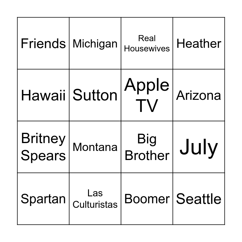 This bingo card has 29 words: Justin, Leo, July, Star Trek, Friends, Real Housewives, Apple TV, Rupaul, Las Culturistas, The Kardashians, Boomer, Spartan, Breckinridge, Palm Springs, Montana, Grand Canyon, Mt. Rushmore, Seattle, Hawaii, Big Brother, Matt Rogers, Ross Mathews, Britney Spears, Sutton, Heather, Michigan, Monroe, Arizona and Tucson.