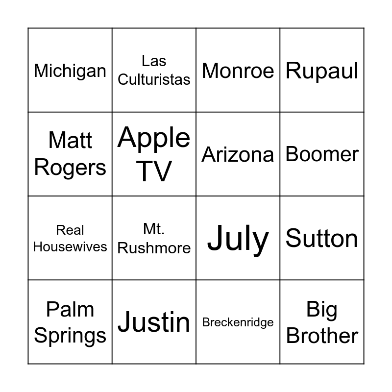 This bingo card has 29 words: Ross Mathews, Britney Spears, Sutton, Heather, Michigan, Monroe, Arizona, Tucson, Justin, Leo, Breckenridge, Palm Springs, Montana, Grand Canyon, Mt. Rushmore, Seattle, Hawaii, Big Brother, Matt Rogers, July, Star Trek, Friends, Real Housewives, Apple TV, Rupaul, Las Culturistas, The Kardashians, Boomer and Spartan.