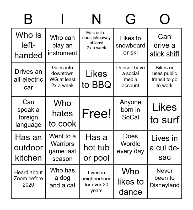 This bingo card has a free space and 24 words: Went to a Warriors game last season, Who has a dog and a cat, Likes to BBQ, Heard about Zoom before 2020, Can drive a stick shift, Who is left-handed, Drives an all-electric car, Who can play an instrument, Anyone born in SoCal, Has a hot tub or pool, Doesn't have a social media account, Can speak a foreign language, Does Wordle every day, Lives in a cul de-sac, Goes into downtown WG at least 2x a week, Who likes to dance, Likes to surf, Eats out or does takeaway at least 2x a week, Bikes or uses public transit to go to work, Who hates to cook, Never been to Disneyland, Has an outdoor kitchen, Likes to snowboard or ski and Lived in neighborhood for over 20 years.