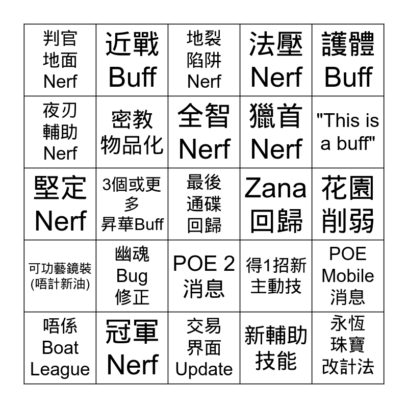 This bingo card has 25 words: 幽魂 Bug 修正, 交易 界面Update, 全智 Nerf, 唔係Boat League, 護體 Buff, 判官 地面Nerf, 夜刃 輔助Nerf, 近戰 Buff, Zana回歸, POE 2 消息, 獵首 Nerf, 堅定 Nerf, 得1招新主動技, POE Mobile 消息, 密教 物品化, 永恆 珠寶 改計法, 花園削弱, 地裂 陷阱 Nerf, "This is a buff", 3個或更多 昇華Buff, 最後 通碟 回歸, 冠軍 Nerf, 可功藝鏡裝 (唔計新油), 法壓 Nerf and 新輔助技能.