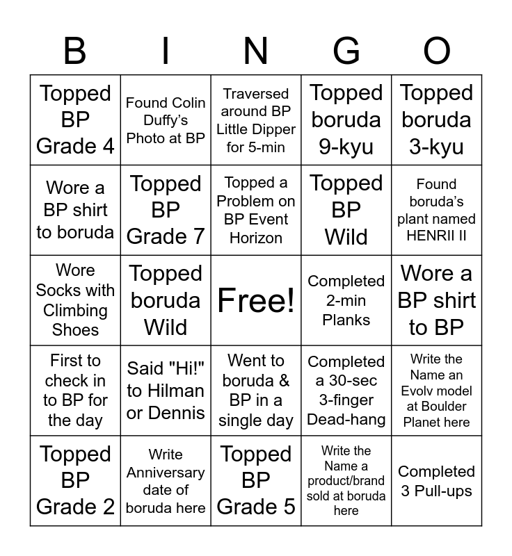 This bingo card has a free space and 56 words: Topped BP Grade 1, Topped BP Grade 2, Topped BP Grade 3, Topped BP Grade 4, Topped BP Grade 5, Topped BP Grade 6, Topped BP Grade 7, Topped BP Grade 8, Topped BP Wild, Topped boruda 10-kyu, Topped boruda 9-kyu, Topped boruda 8-kyu, Topped boruda 7-kyu, Topped boruda 6-kyu, Topped boruda 5-kyu, Topped boruda 4-kyu, Topped boruda 3-kyu, Topped boruda Wild, Stayed on the Balance Board for 1-min, Completed 3 Pull-ups, Completed 2-min Planks, Completed 10 Push-ups, Completed a 30-sec 3-finger Dead-hang, Traversed around BP Little Dipper for 5-min, Topped a Problem on boruda Spray Wall, Topped a Problem on BP Event Horizon, Found boruda’s plant named SANDDII, Found boruda’s plant named HENRII, Found boruda’s plant named HENRII II, Found boruda’s plant named HENRII III, Found boruda’s plant named TERRII, Found boruda’s plant named snekkii, Wore a boruda shirt to boruda, Wore a boruda shirt to BP, Wore a BP shirt to BP, Wore a BP shirt to boruda, Wore Socks with Climbing Shoes, First to Check In to boruda for the day, First to check in to BP for the day, Found Colin Duffy’s Photo at BP, Went to boruda & BP in a single day, Spoke to 2 random people at the gym, Spoke to a BP gym staff about the weather, Spoke to a boruda gym staff about the weather, Set a boulder on boruda Stoke app, Said "Hi!" to Hilman or Dennis, Write Anniversary date of boruda here, Write Anniversary date of Boulder Planet here, Write the Name a member of the boruda team here, Write the Name a member of the Boulder Planet team here, Write the Name a product/brand sold at boruda here, Write the Name a product/brand sold at Boulder Planet here, Write the Name a section of wall at boruda here, Write the Name a section of wall at Boulder Planet here, Write the Name an Evolv model at Boulder Planet here and Write the Name a Tenaya model at boruda here.
