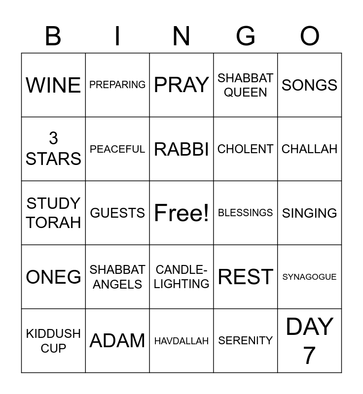 This bingo card has a free space and 24 words: SHABBAT ANGELS, ADAM, RABBI, KIDDUSH CUP, SONGS, WINE, 3 STARS, PREPARING, BLESSINGS, CANDLE-LIGHTING, CHOLENT, STUDY TORAH, REST, SYNAGOGUE, PEACEFUL, SERENITY, SINGING, PRAY, CHALLAH, GUESTS, DAY 7, ONEG, SHABBAT QUEEN and HAVDALLAH.