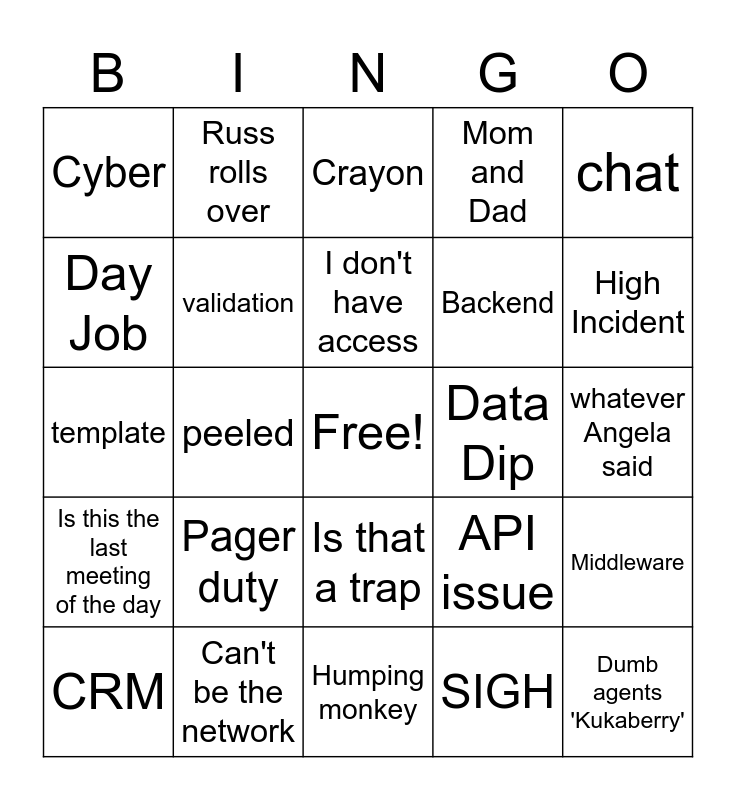 This bingo card has a free space and 24 words: Pager duty, Can't be the network, I don't have access, CRM, chat, Cyber, Day Job, Russ rolls over, Data Dip, Is that a trap, Backend, template, API issue, Middleware, validation, SIGH, whatever Angela said, Crayon, High Incident, peeled, Dumb agents 'Kukaberry', Is this the last meeting of the day, Mom and Dad and Humping monkey.