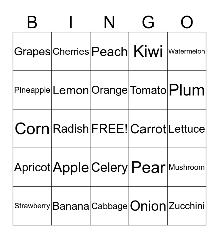 This bingo card has a free space and 24 words: Apple, Banana, Orange, Strawberry, Watermelon, Grapes, Pineapple, Cherries, Carrot, Celery, Tomato, Corn, Pear, Mushroom, Lemon, Onion, Lettuce, Peach, Plum, Radish, Zucchini, Apricot, Kiwi and Cabbage.
