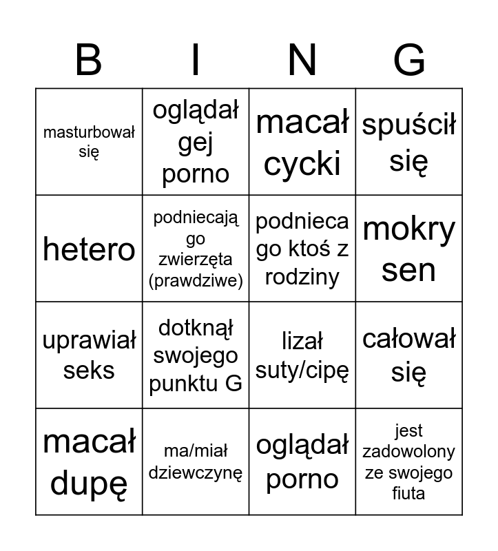 This bingo card has 16 words: ma/miał dziewczynę, całował się, macał cycki, masturbował się, uprawiał seks, oglądał gej porno, lizał suty/cipę, oglądał porno, hetero, podniecają go zwierzęta (prawdziwe), macał dupę, spuścił się, dotknął swojego punktu G, mokry sen, podnieca go ktoś z rodziny and jest zadowolony ze swojego fiuta.