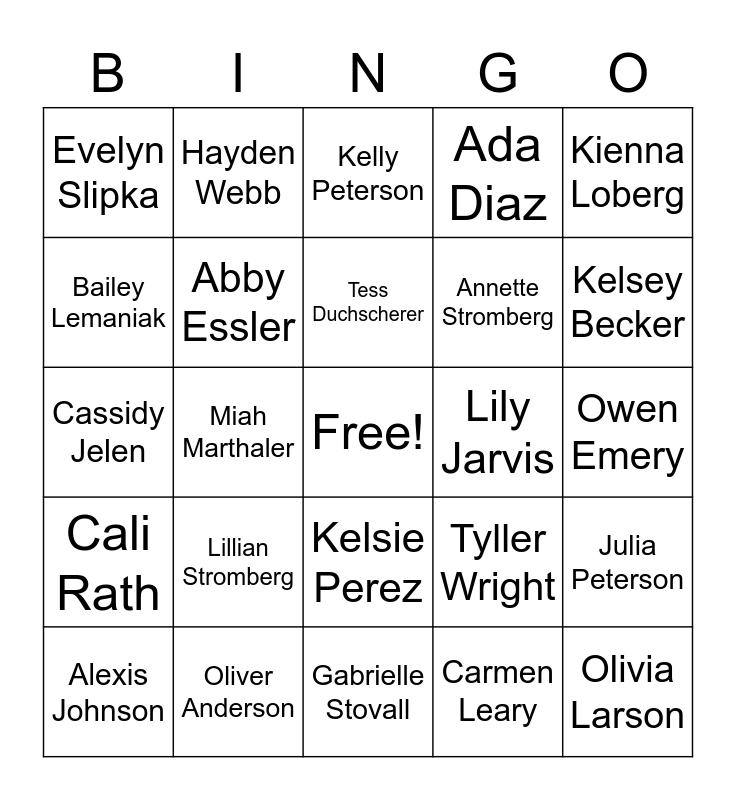 This bingo card has a free space and 49 words: Emma Launstein, Olivia Larson, Sofia Serafin, Gabrielle Stovall, Lillian Stromberg, Madison Nelson, Hayden Webb, Emery Chumbley, Bailey Lemaniak, Olivia LaMantia, Abby Essler, Ada Diaz, Julia Peterson, Tyller Wright, Meredith Garms, Ana Paetznick, Tess Duchscherer, Lily Jarvis, Brooklyn Childs, Kienna Loberg, Miah Marthaler, Carmen Leary, Evelyn Slipka, Annette Stromberg, Hannah Brink, Kelsey Becker, Alexis Johnson, Charlize Mohammed, Kelsie Perez, Cali Rath, Kayley Swenson, Grant Reitsma, Carter Rath, Cooper Zydowsky, Oliver Anderson, Tyson Holder, Cooper Kent, Brandon Ritter, Owen Emery, Rory Kittleson, Daniel Kunze, Alex Noonkesser, Amy Lemaniak, Aylina Chum-Phan, Cassidy Jelen, Kelly Peterson, Alani Casper, Aaron Kabat and Dave Neumann.