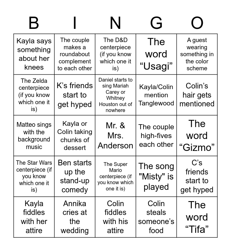 This bingo card has a free space and 37 words: Kayla says sorry about something, One mom cries, Both moms cries, K’s friends start to get hyped, C’s friends start to get hyped, Ben starts up the stand-up comedy, Daniel starts to sing Mariah Carey or Whitney Houston out of nowhere, Kayla/Colin talking about their cats, A guest wearing something in the color scheme, Kayla or Colin start talking about video games, Kayla or Colin taking chunks of dessert, The word “Usagi”, The word “Tifa”, The word “Gizmo”, The Zelda centerpiece (if you know which one it is), The Star Wars centerpiece (if you know which one it is), The Sailor Moon centerpiece (if you know which one it is), The D&D centerpiece (if you know which one it is), The Super Mario centerpiece (if you know which one it is), The couple high-fives each other, Kayla says something about her knees, Colin’s hair gets mentioned, Kayla fiddles with her attire, Colin fiddles with his attire, Kayla steals someone’s food, Colin steals someone’s food, The couple makes a roundabout complement to each other, A toast is given by the bride or groom, A toast is given by the bridal party, A toast is given by the groom party, The riverside view, Annika cries at the wedding, Matteo sings with the background music, Mac presents a sword somehow, The song "Misty" is played, Kayla/Colin mention Tanglewood and Kayla/Colin mention something related to Japan.