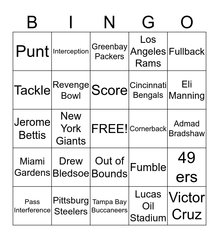 This bingo card has a free space and 24 words: Drew Bledsoe, Pittsburg Steelers, Score, Pass Interference, Fullback, Punt, Tackle, Interception, Cornerback, Out of Bounds, Cincinnati Bengals, Jerome Bettis, Fumble, 49 ers, Revenge Bowl, Lucas Oil Stadium, Admad Bradshaw, Greenbay Packers, Eli Manning, New York Giants, Victor Cruz, Miami Gardens, Los Angeles Rams and Tampa Bay Buccaneers.