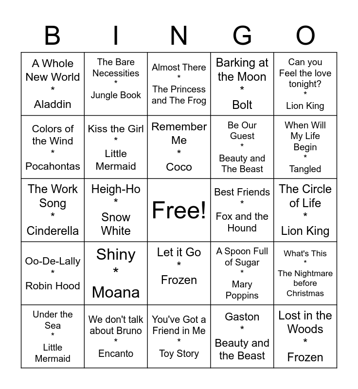 This bingo card has a free space and 24 words: Shiny * Moana, We don't talk about Bruno * Encanto, Remember Me * Coco, Under the Sea * Little Mermaid, Can you Feel the love tonight? * Lion King, A Whole New World * Aladdin, Colors of the Wind * Pocahontas, The Bare Necessities * Jungle Book, Best Friends * Fox and the Hound, Let it Go * Frozen, Be Our Guest * Beauty and The Beast, The Work Song * Cinderella, A Spoon Full of Sugar * Mary Poppins, What's This * The Nightmare before Christmas, Kiss the Girl * Little Mermaid, Gaston * Beauty and the Beast, The Circle of Life * Lion King, Almost There * The Princess and The Frog, When Will My Life Begin * Tangled, Heigh-Ho * Snow White, Lost in the Woods * Frozen, Oo-De-Lally * Robin Hood, Barking at the Moon * Bolt and You've Got a Friend in Me * Toy Story.